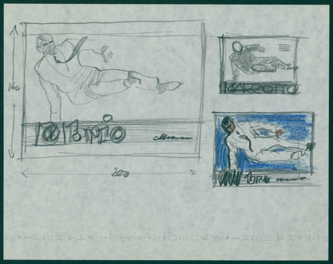 Studio per manifesto pubblicitario della società Marzotto. uomini con abiti eleganti eseguono un salto laterale