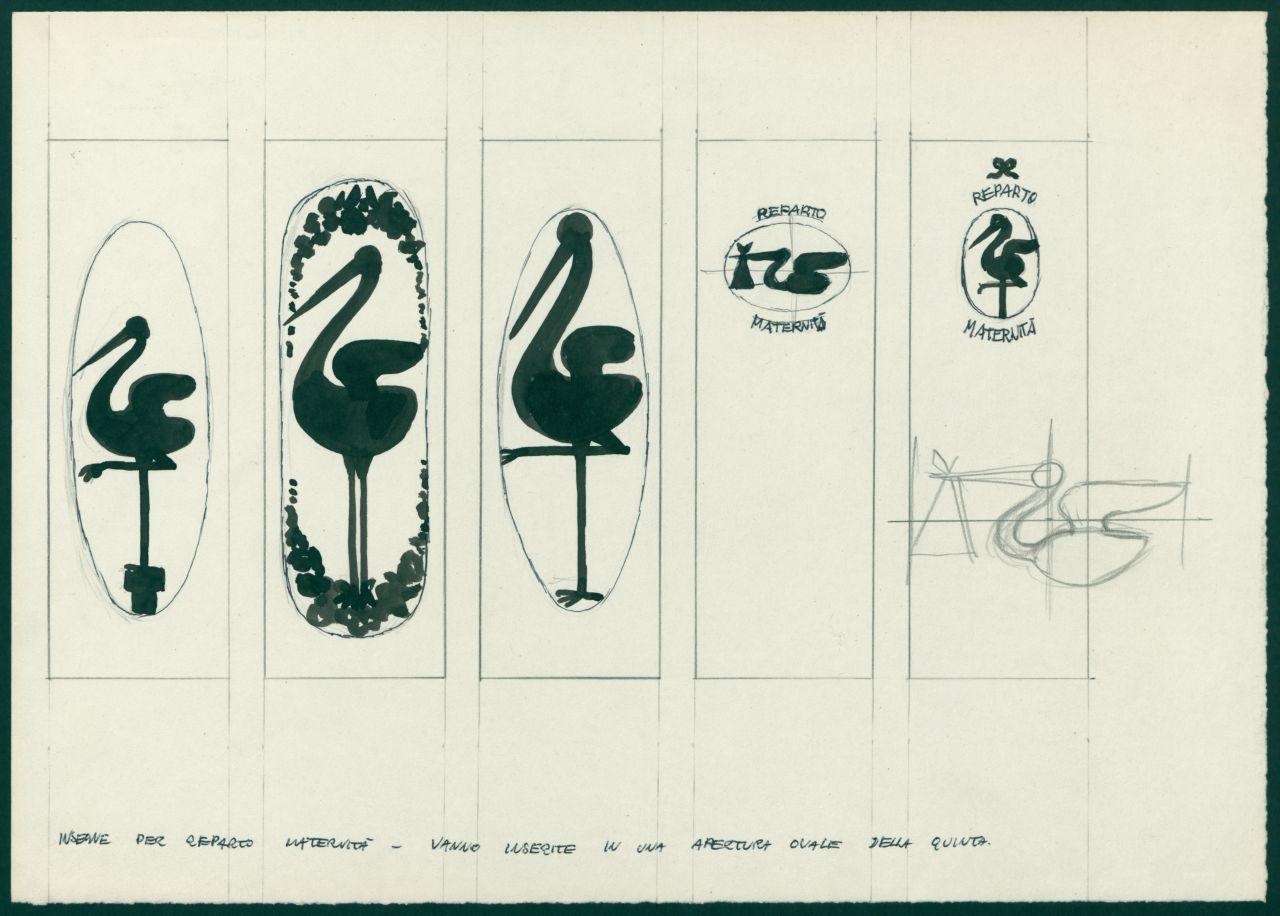 Bozzetto per insegne al reparto maternità dei grandi magazzini la Rinascente. silhouette di cicogne