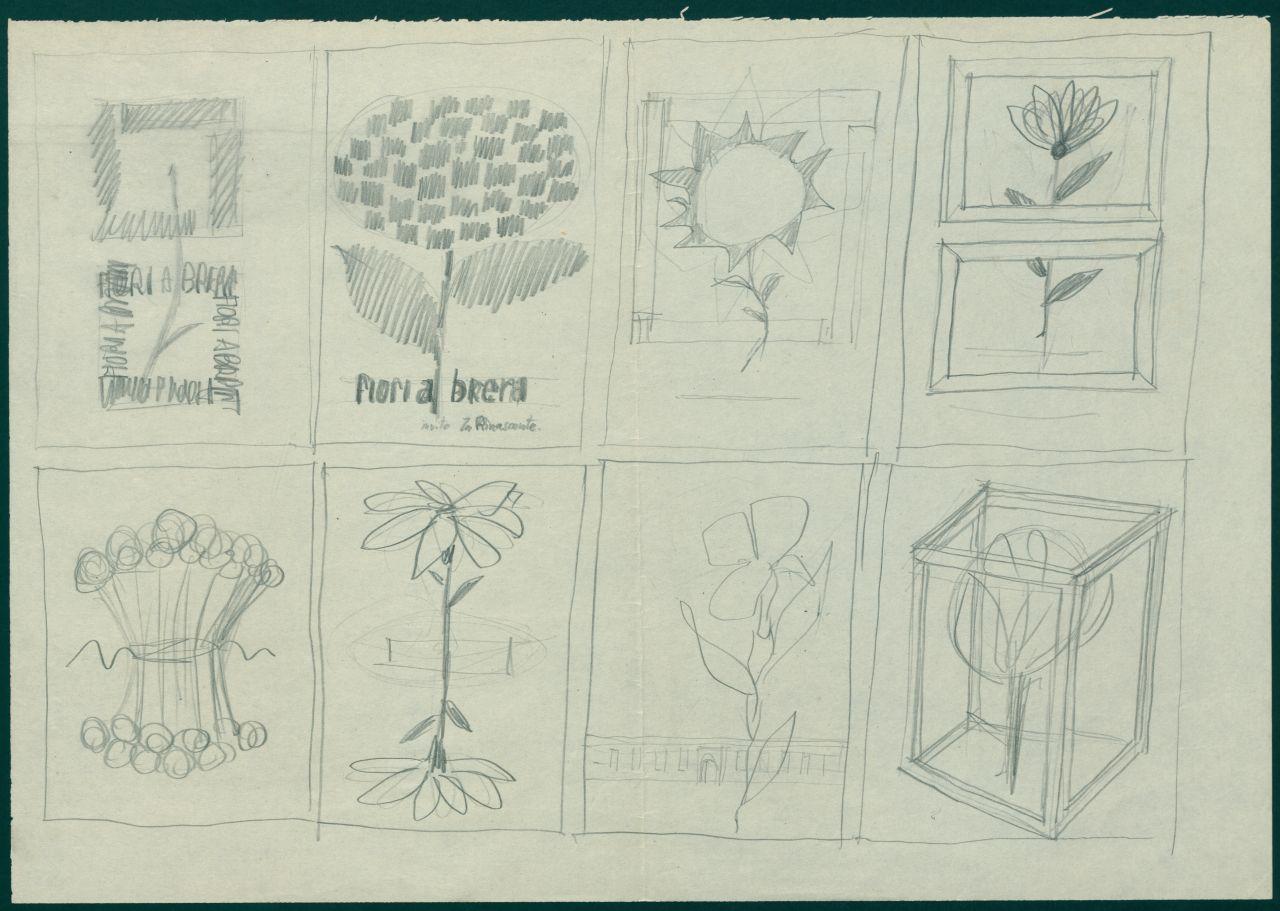 - NOTIZIE STORICO CRITICHE Schizzo eseguito da Giancarlo Iliprandi per la proposta di un manifesto per l'iniziativa "Fiori a Brera", che trasformò la Pinacoteca in un giardino grazie a la Rinascente, dal 29 aprile al 6 maggio 1956