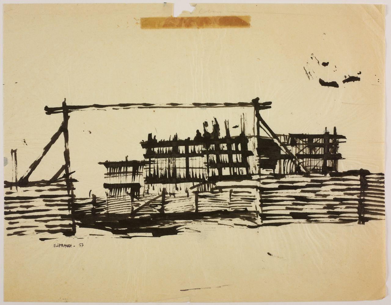 - NOTIZIE STORICO CRITICHE Nel gennaio 1958 Giancarlo Iliprandi espone i suoi dipinti della serie Case e cantieri alla Galleria dell'Ariete a Milano per cui viene pubblicato il ventinovesimo catalogo della Galleria con testo dell'amico e collega pittore Emilio Tadini. La pittura di Iliprandi registrava la rinascita e l'espansione urbanistica della Milano dell'immediato secondo dopoguerra, che Iliprandi segue con interesse, soprattutto riguardo la zona dove abita (via Ampere 55) allora interessata dal cantiere della nuova Facoltà di Architettura così come del palazzo di Gio Ponti in via Vallazze 63 dove il giovane acquista un appartamento e si trasferisce nel dicembre 1957.