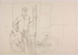 Bozzetto per il catalogo della campagna pubblicitaria del marchio di abbigliamento Facis, stagione primavera-estate 1962. attacchino con bicicletta e scala davanti a manifesti