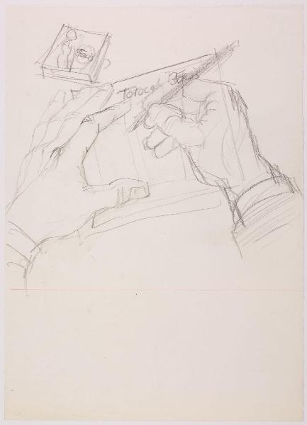 Bozzetto per il catalogo della campagna pubblicitaria del marchio di abbigliamento Facis, stagione primavera-estate 1962. dettaglio di mani mentre compilano una schedina del Totocalcio e scatola di fiammiferi