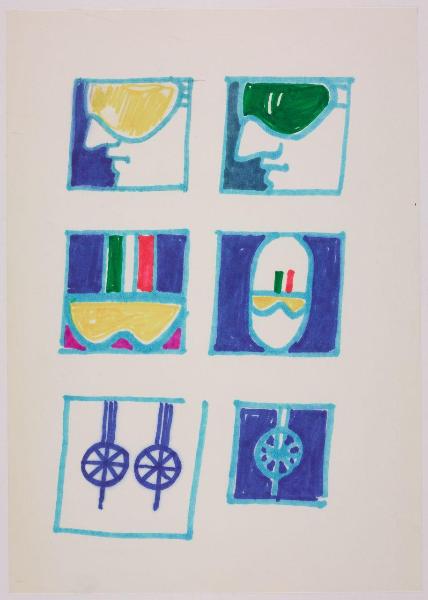 Disegni riquadrati realizzati con pennarelli colorati su carta bianca.