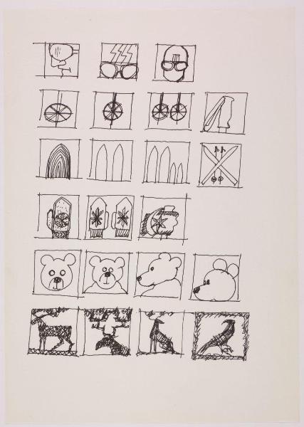 Disegni riquadrati realizzati con inchiostro nero su carta bianca.