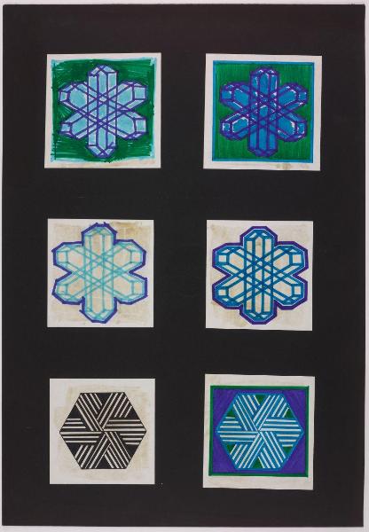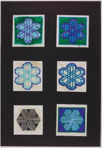 Disegni riquadrati realizzati con pennarelli colorati su ritagli di carta bianca incollata su cartoncino nero.