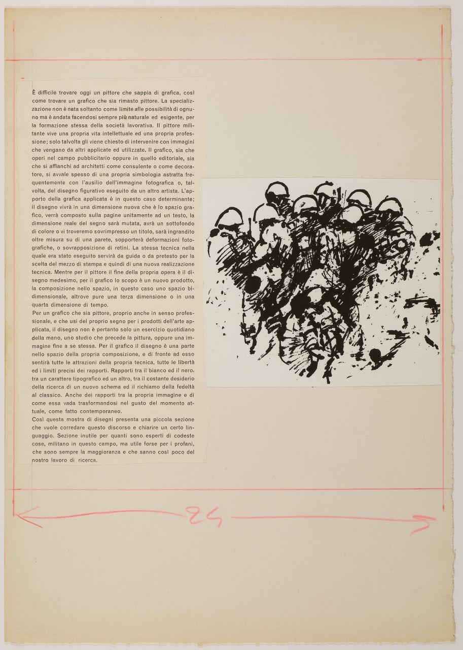 - NOTIZIE STORICO CRITICHE A partire dai disegni ispirati alla strage di Reggio Emilia (luglio 1960) esposti alla Libreria Salto di Milano nel 1961, Iliprandi parte per una riflessione, teorica e grafica, sul rapporto tra grafica e disegno creando una sequenza ragionata d'immagini introdotta da un breve testo sul rapporto tra disegno e grafica. Dalla fine stessa del testo sembrerebbe che tale materiale costituisse una sezione speciale della mostra "che vuole corredare questo discorso e chiarire un certo linguaggio. Sezione inutile per quanti sono esperti di codeste cose, militano in questo campo, ma utile forse per i profani, che sono sempre la maggioranza e che sanno così poco del nostro lavoro di ricerca". Lo stesso testo con una selezione d'immagini è pubblicato sulla rivista "Serigrafia" nel maggio-giugno 1963 con il titolo Incontro fra la grafica e il disegno.