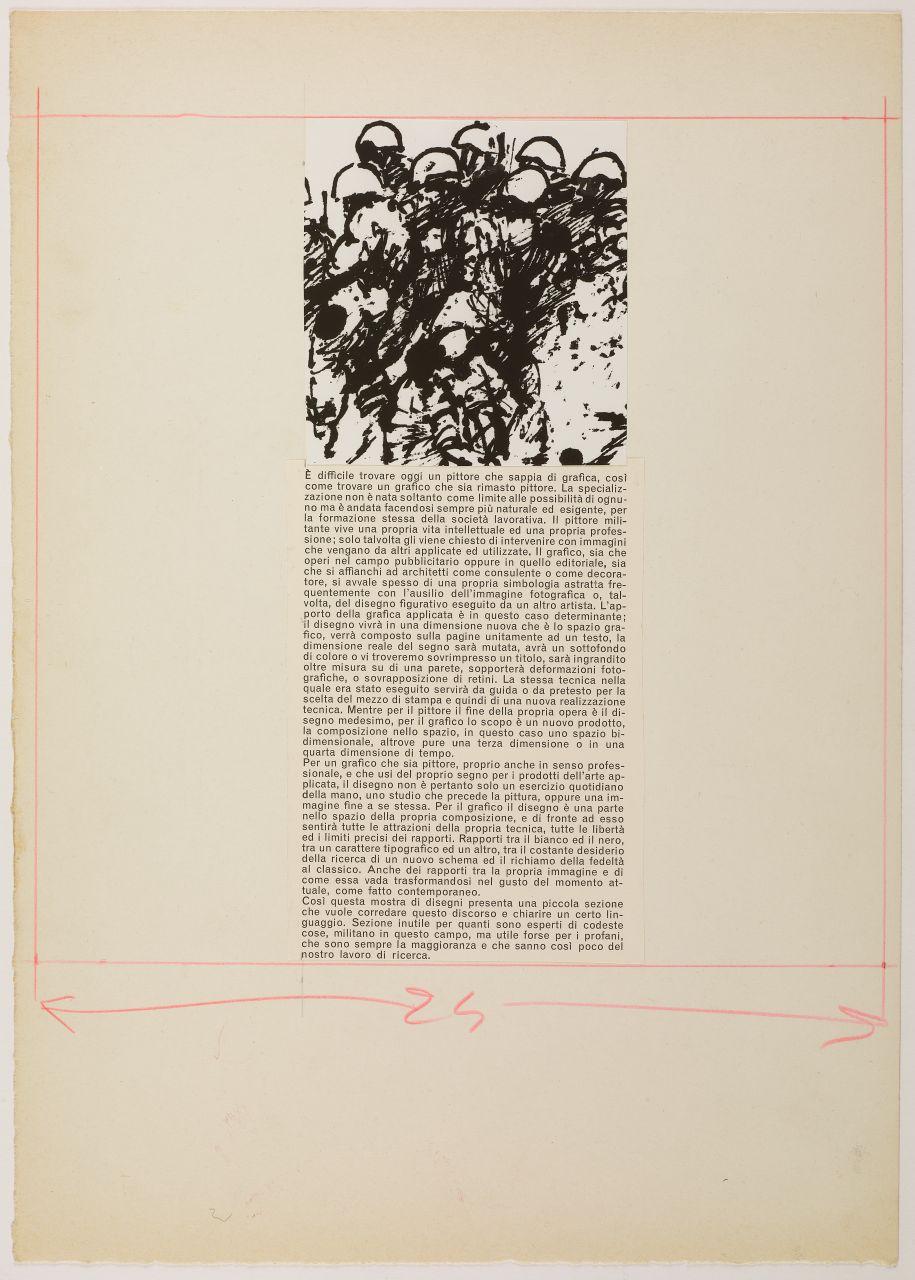 - NOTIZIE STORICO CRITICHE A partire dai disegni ispirati alla strage di Reggio Emilia (luglio 1960) esposti alla Libreria Salto di Milano nel 1961, Iliprandi parte per una riflessione, teorica e grafica, sul rapporto tra grafica e disegno creando una sequenza ragionata d'immagini introdotta da un breve testo sul rapporto tra disegno e grafica. Dalla fine stessa del testo sembrerebbe che tale materiale costituisse una sezione speciale della mostra "che vuole corredare questo discorso e chiarire un certo linguaggio. Sezione inutile per quanti sono esperti di codeste cose, militano in questo campo, ma utile forse per i profani, che sono sempre la maggioranza e che sanno così poco del nostro lavoro di ricerca". Lo stesso testo con una selezione d'immagini è pubblicato sulla rivista "Serigrafia" nel maggio-giugno 1963 con il titolo Incontro fra la grafica e il disegno.