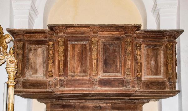 Cantoria in legno di noce intagliato, modanato e scolpito