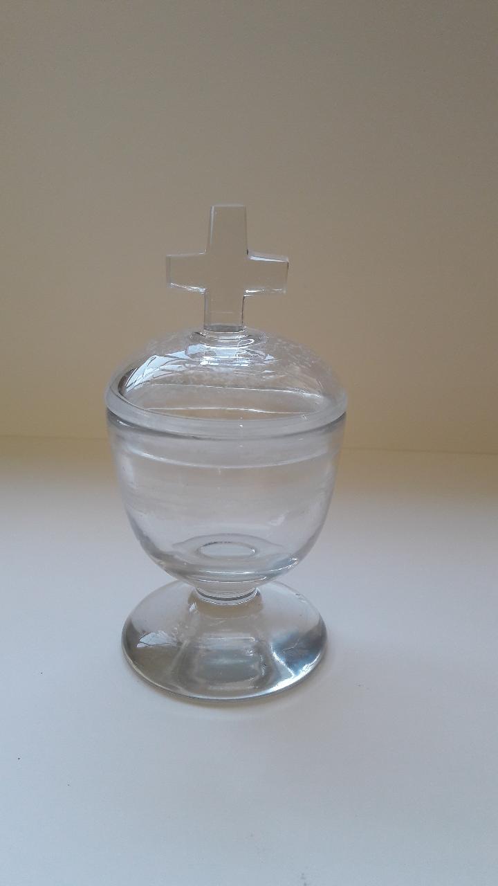 Acquasantiera con coperchio in cristallo molato e intagliato; sulla sommità del coperchio è presente una croce.