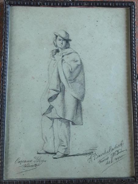 - NOTIZIE STORICO CRITICHE L'opera fa parte del nucleo più importante della collezione Macchi, composta da una serie di disegni e dipinti dell’artista Filippo Carcano (1840-1914), realizzati nella seconda metà dell'Ottocento, che riprendono soggetti di costume o ritratti religiosi e sono realizzati con tecniche diverse, come il carboncino, dipinti all’acquerello oppure a olio. \nIl disegno è stato realizzato nel suo periodo giovanile di formazione presso l’Accademia di Brera, dedicato al suo compagno di studi, Angelo Bacchetta.\nProbabilmente l'opera proviene da un album, incorniciata singolarmente in epoca successiva.\n\n\nFilippo Carcano nacque nel 1840 a Milano.\nA 15 anni si iscrisse all’Accademia di Brera, frequentando il corso di pittura sotto la guida di Francesco Hayez e poi di Giuseppe Bertini.\nDebuttò nel 1862 alla mostra annuale dell’Accademia con il dipinto Federico Barbarossa e Enrico il Leone a Chiavenna.\nQuesto gli valse il premio Canonica per pittori lombardi dell’800 e 900.\nPoco più tardi dipinse La piccola fioraia, imprimendo una decisa svolta ai suoi orientamenti pittorici attraverso una maggiore attenzione agli effetti cromatici e luminosi e una più fedele resa del vero.\nTale cambiamento raggiunse il culmine nelle due opere presentate a Brera, Una lezione di ballo e Una partita al bigliardo.\nTali dipinti furono però giudicati dalla critica troppo realistici e simili ad una foto.\nAgli inizi degli anni ‘80, dopo aver finalmente ottenuto importanti riconoscimenti, come la nomina a socio onorario di Brera (1874) e la vincita del premio Mylius con il dipinto Buon cuore infantile (1878), iniziò ad avere successo anche all’estero.\nSi dedicò alla pittura di paesaggio realizzando numerose vedute della campagna lombarda e del Lago Maggiore.\nOramai celebre, nel 1881 all’Esposizione Nazionale di Belle Arti, presentò un dipinto con forti toni sociali: L’ora del riposo durante i lavori dell’Esposizione del 1881.\nL’anno successivo vinse il Premio intitolato al Principe Umberto con Piazza San Marco a Venezia.\nSeguirono numerose partecipazioni ad esposizioni nazionali ed internazionali, intervallate da spericolate escursioni su nevai e ghiacciai della Svizzera.\nFilippo Carcano morì a Milano nel 1914.\n(Giordano Luisa, Carcano Filippo, in Dizionario biografico degli italiani, vol. 19 - Roma, Istituto dell'Enciclopedia Italiana, 1976; Cesura Guido, Filippo Carcano (Milano, 1840-1914), prefazione di Predaval Gustavo - Milano, Cavallotti 1986).\n\n\n\n \n\n\n\n