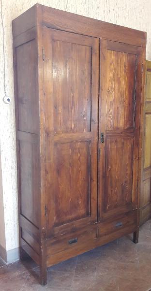 Armadio a due ante con due cassetti nella parte inferiore. Presenza di specchiature rettangolari lungo il fronte e i laterali; maniglie con motivi decorativi floreali di gusto liberty.