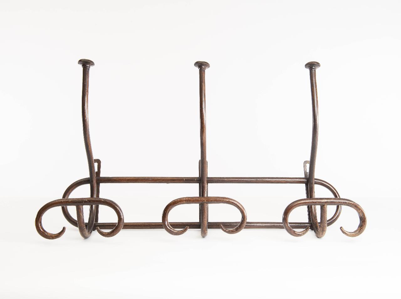 Attaccapanni da parete in ferro dipinto imitante il legno, munito di tre appendini per gli abiti e i cappelli. Nei vari elementi che compongono il manufatto predomina la linea curva.