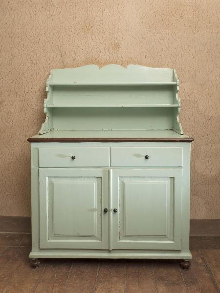 Credenza con piattaia in legno massello verniciato di verde chiaro.\nFronte corpo dotato di due cassetti nella fascia sottopiano e coppia di ante pannellate, piedi torniti a cipolla. Corpo superiore dato da due ripiani uniti da montanti a forma di ricciolo, cimasa modanata. Prese a pomolo in metallo verniciato. Piedini e profilo del piano d'appoggio superiore dipinti in marrone.