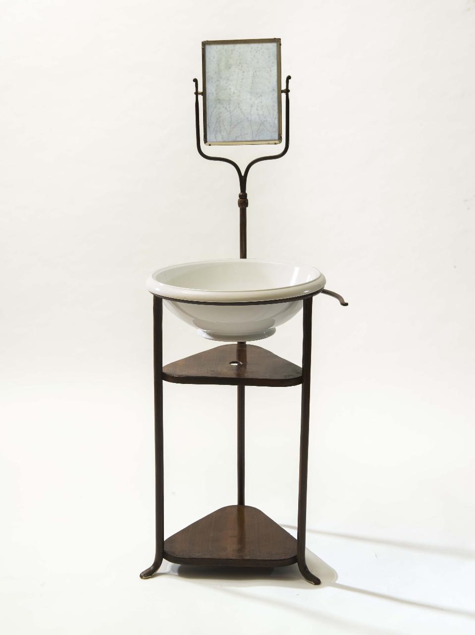 Lavabo con struttura in ferro a doppio ripiano (il primo partendo dall'alto presenta un foro al centro), specchio basculante nella parte superiore; sorregge un catino in ceramica bianca. Le parti in metallo risultano dipinte ad imitazione del legno.