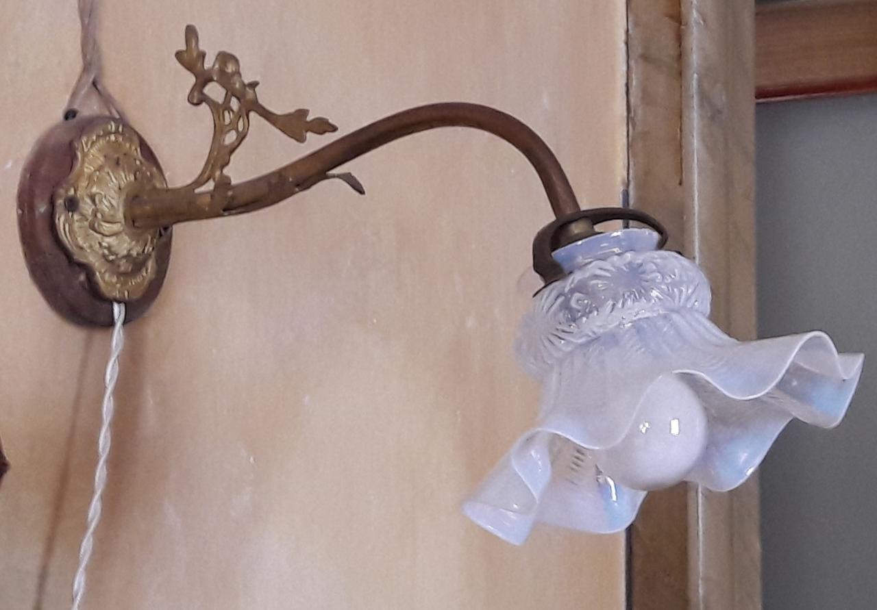 Coppia di lampade da parete caratterizzate da un vetro opalino iridescente a forma di fiore, unito ad una struttura in ottone lavorato a mano che ricorda un ramo d'albero tipico dei primi del '900. Il vetro opalescente ha caratteristiche eleganti cambiando tonalità a seconda della luce.