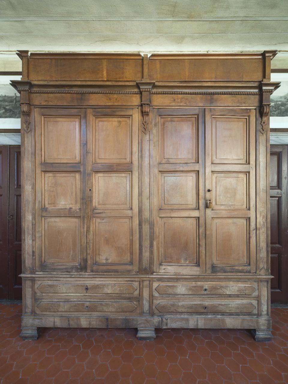 Grande armadio in legno massello poggiante su piedini sagomati con quattro ante decorate con specchiature rettangolari sottolineate da cornicette modanate e quattro cassetti inferiori con cornicette mistilinee. Internamente la parte destra dell'armadio presenta vari piani d'appoggio, nella parte sinistra un'asta per appendere gli abiti. Coronamento superiore dato da cornice dentellata e motivi ornamentali a intaglio.\nAll'interno è riposta biancheria varia per la casa e per la persona: asciugamani, asciugapiatti, salviette, copriletti, pizzi, centrini, bottoni, vestiti, accessori femminili. Ci sono materiali antichi ma anche più moderni.