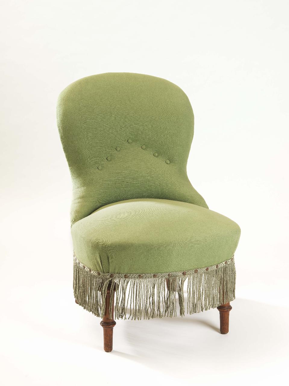 Coppia di due poltrone con struttura portante in legno massello, schienale sagomato, gambe anteriori tornite, ricoperte da tessuto in cotone pesante (una di color verde e l'altra di color marrone) con passamaneria.