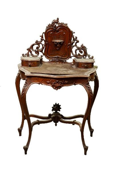 Tavolino da toeletta in legno di noce finemente intagliato a motivi rocaille. Piano d'appoggio sagomato e modanato rivestito in parte da tessuto (cotone pesante), cassetto nel sottopiano, gambe mosse raccordate da crociera a "X" intagliata.\nNella parte superiore, alzatina riccamente intagliata con motivi di gusto rocaille, tra cui riccioli ed elementi fogliacei; mensolina nella parte centrale e cassettini ai lati con pomello in metallo stampato a forma di fiore stilizzato.