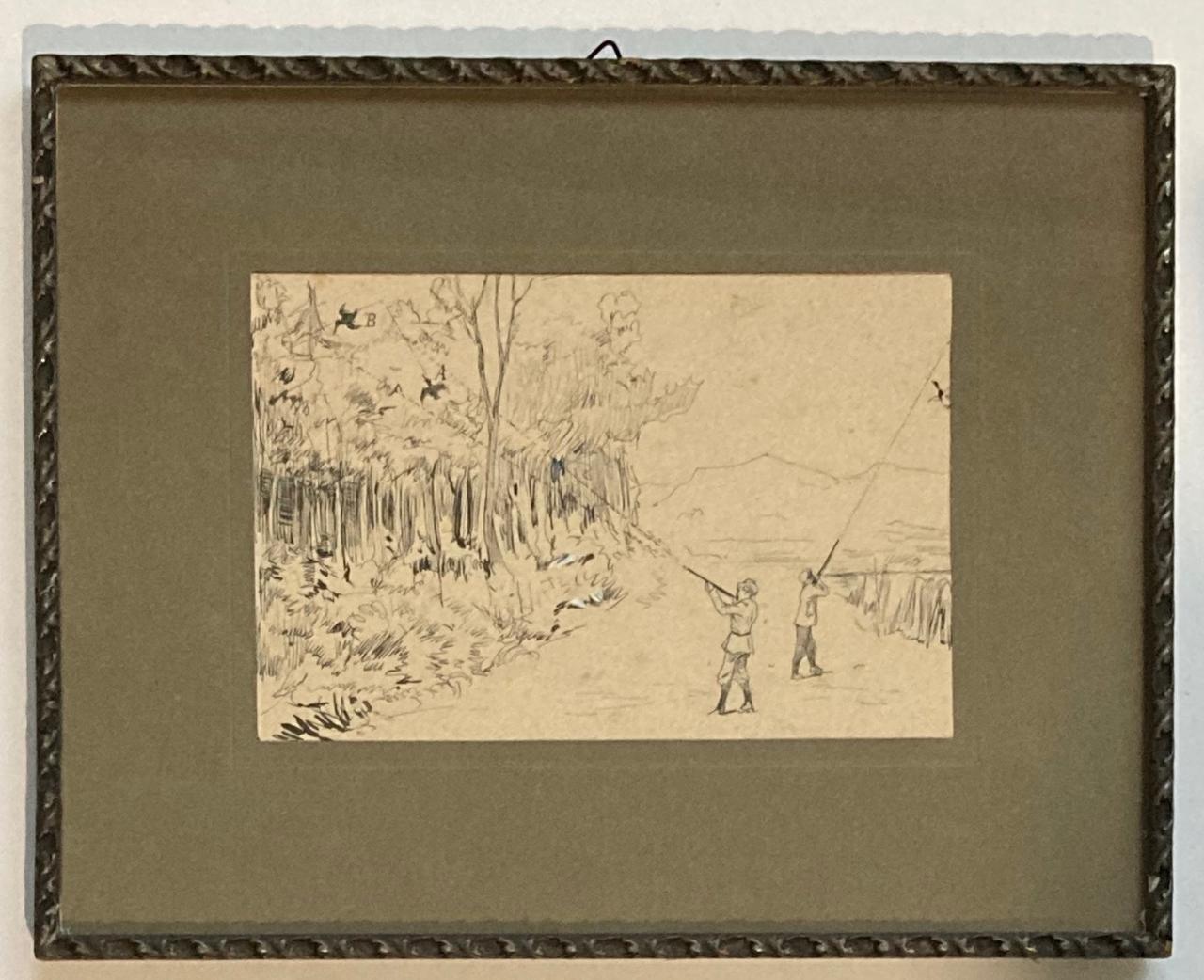 Disegno tracciato a china e tempera bianca, montato su cartone, in cornice con finestra passepartout al recto.\nRaffigura due cacciatori posti in basso a destra che stanno sparando a volatili: lo sfondo è dato da un fitto bosco sulla sinistra, montagne sullo sfondo.\nLa semplice cornice è in legno modanato con tracce di argentatura.