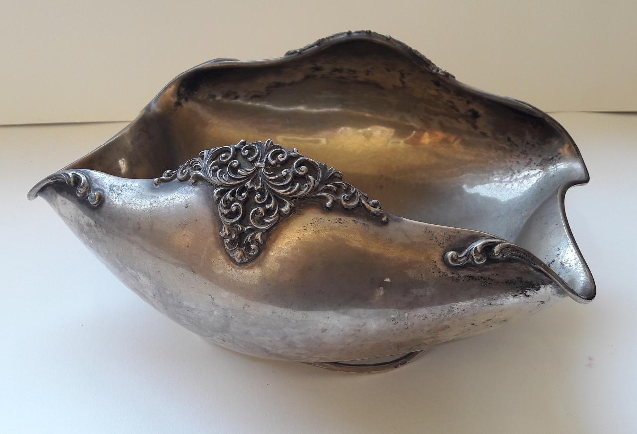 Ciotola in lamina d'argento sbalzato dalla forma mossa; lungo il bordo superiore, motivi decorativi vegetali realizzati a fusione e successivamente applicati.