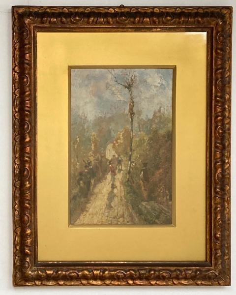 L'opera è all'interno di una cornice in legno modanato e dorato, passepartout in cartoncino dorato.\nIl dipinto raffigura una figura maschile arrampicata ad un albero e tutt'attorno, in basso lungo un sentiero, gli astanti che osservano con gli sguardi rivolti verso l'alto. L'ambientazione è data da una folta vegetazione e da un cielo tempestato da nuvole. Predomina la massa del colore e non la linea di contorno nella definizione dei vari elementi della composizione; un colore steso attraverso pennellate veloci, contrasti tra luci e ombre.