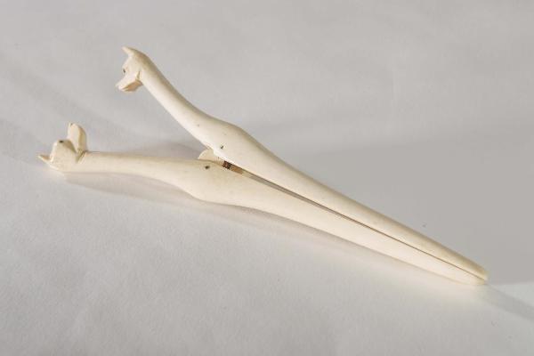 Pinza antica allarga guanti in avorio, impugnatura a forma di teste di cani affrontati; serviva ad "allargare" i guanti prima di essere indossati.