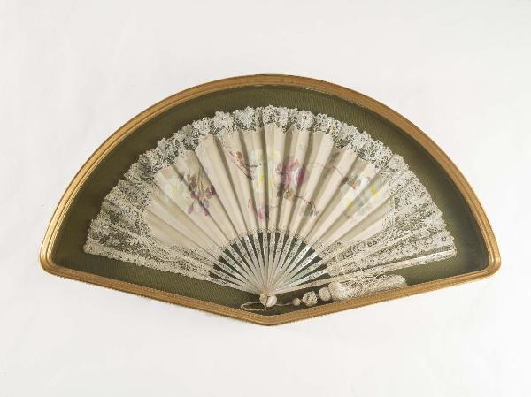 Ventaglio con stecche in madreperla incise a motivi vegetali. Pavese in seta e pizzo con fiori dipinti. Il ventaglio è conservato in teca con cornice in legno modanato e dorato.