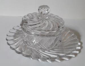 Formaggera con coperchio in cristallo molato e sfaccettato con lavorazione a torchon. Il piattino e il corpo della formaggera sono un pezzo unico.