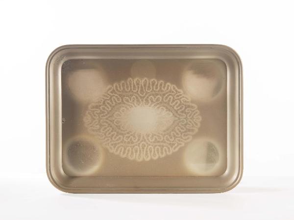 Semplice vassoio in metallo argentato con bordi modanati.\nSono stati conservati i segni della polvere impressi dal centrino di pizzo sul vassoio.