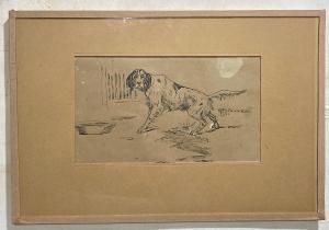 Disegno a inchiostro nero e tempera bianca, con passepartout in cartoncino al recto, montaggio all'europea.\nRaffigura in primo piano un cane da caccia rivolto verso un possibile osservatore esterno all'opera; accanto a lui è presente la ciotola per il cibo e l'acqua. \n