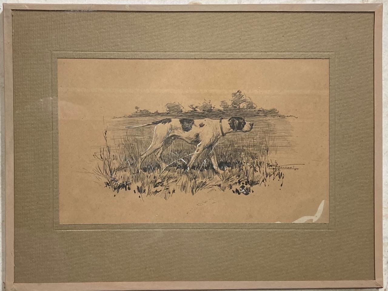 - NOTIZIE STORICO CRITICHE A Casa Macchi il tema dominante della collezione è venatorio: ricorrono ritratti, caricature o fotografie di animali e cani da caccia, insieme a scene di caccia. \nGiuseppe, Carlo e Battista Macchi, nonno, papà e zio di Maria Luisa, erano appassionati di caccia e pesca, tipici passatempi degli uomini dell'epoca: molti i cimeli custoditi in casa.\nUn nucleo importante della collezione (circa una quarantina di pezzi di diverso formato e tecnica) riporta la firma dell’illustratore Alfredo Vaccari (Torino 1877-1933). L'artista le risolve tecnicamente in modo diverso; vi si riconoscono disegni tracciati a china e tempera bianca o bozzetti tipografici. Buona parte di questi disegni provengono da un medesimo album da cui sono stati staccati per essere montati in cornici.\nLa maggior parte delle opere è conservata all’interno di un’incorniciatura ottocentesca.\nVi sono numerose opere incorniciate in stile europeo comune nel periodo di fine ottocento per l’incorniciatura di ritratti fotografici, in questo caso il sistema è stato esteso anche per disegni venatori e ritratti di cani. Si tratta essenzialmente di una cornice molto semplice caratterizzata da un vetro, da un passe-partout, dall’opera grafica o fotografica e da una base in cartone, il tutto sigillato da nastro perimetrale in carta gommata a volte decorativa; alcune recano sul retro l’etichetta “Ambrogio Pasta, cornici a Milano”, bottega attiva nei primi del Novecento a Milano.