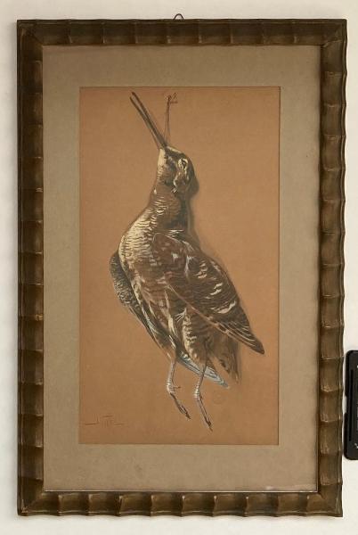 Tempera su carta marroncina incollata su cartone, con finestra passe-partout in cartoncino e montato in cornice. Cornice in legno modanato e dipinto.\nRaffigura in primo piano un volatile morto appeso al muro mediante un cordino. \nIl soggetto è realizzato con tratti veloci ed essenziali, morbidezza nella resa del piumaggio attraverso la massa di colore che predomina sulla linea di contorno, contrasti tra luci e ombre. Traspare dall'opera il senso di morte, la non vitalità del soggetto rappresentato.