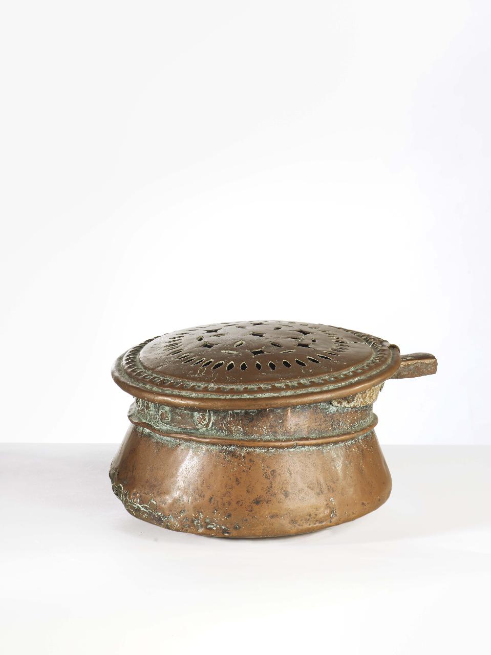 Scaldino in rame battuto a mano con coperchio abbellito da una decorazione ornamentale eseguita a traforo; tali aperture decorative avevano la funzione principale di far uscire il calore dal corpo dello scaldino.