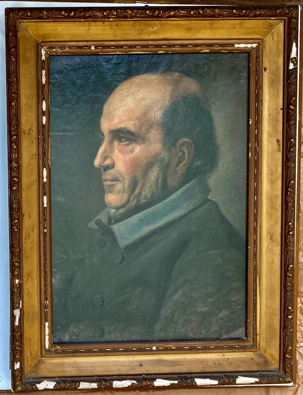 Dipinto realizzato a olio su carta, posto all'interno di una cornice in legno modanato e dorato.\nDa un fondo uniforme e cupo emerge in primo piano il ritratto d'uomo preso di profilo, che occupa quasi l'intero spazio messo a disposizione per la rappresentazione. Ha lo sguardo rivolto verso sinistra; predomina la massa del colore dalle tonalità calde e non la linea di contorno nella definizione dei vari elementi del volto; un colore steso attraverso pennellate veloci, contrasti tra luci e ombre. Morbidezza nella resa della barba e dei capelli; traspare dall'opera una profonda e intima ricerca espressiva del personaggio ritratto, un realismo intenso nella resa dei tratti fisionomici del volto.