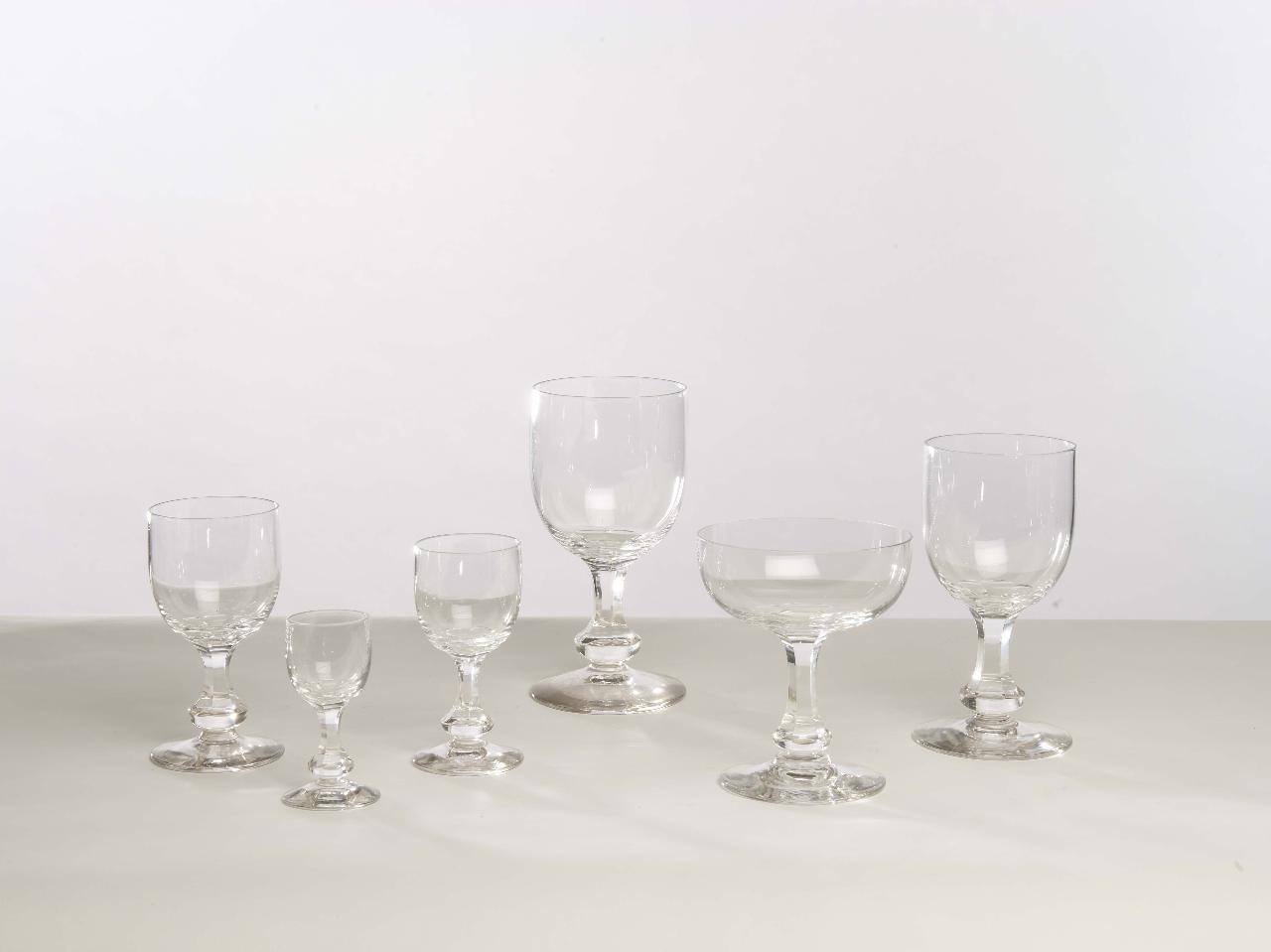 Servizio di bicchieri a calice in cristallo molato, con piede circolare e stelo sfaccettato, composto da: 17 bicchieri per l'acqua, 11 bicchieri per il vino rosso, 14 bicchieri per il rosolio, 12 coppe per lo champagne, 13 bicchieri per il vino bianco e 3 bicchieri per il liquore.\n\n