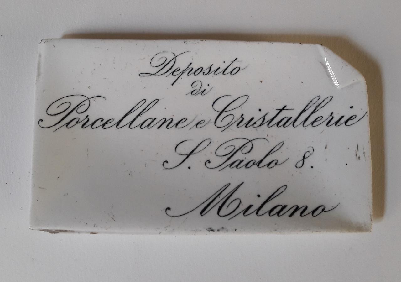 Targhetta pubblicitaria in porcellana bianca con iscrizione realizzata a decalcomania del "Deposito di Porcellane e Cristallerie" di via San Paolo n. 8 a Milano.\n\n