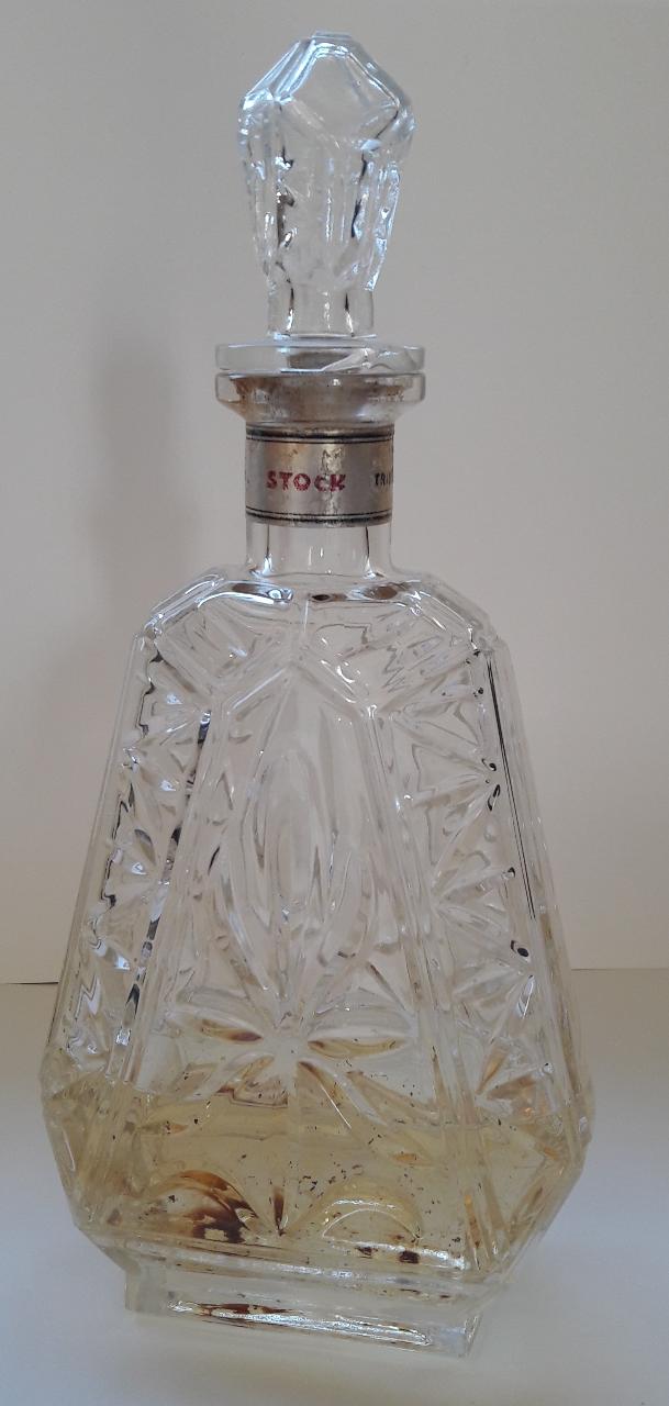 Bottiglia con tappo in vetro stampato con motivi decorativi in rilievo della ditta Stock.