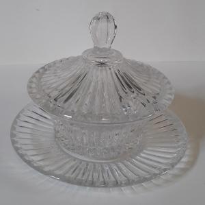 Formaggera in cristallo intagliato e molato composta da piattino, ciotola con mezzaluna per l`inserimento di un cucchiaino e coperchio con pomolo.