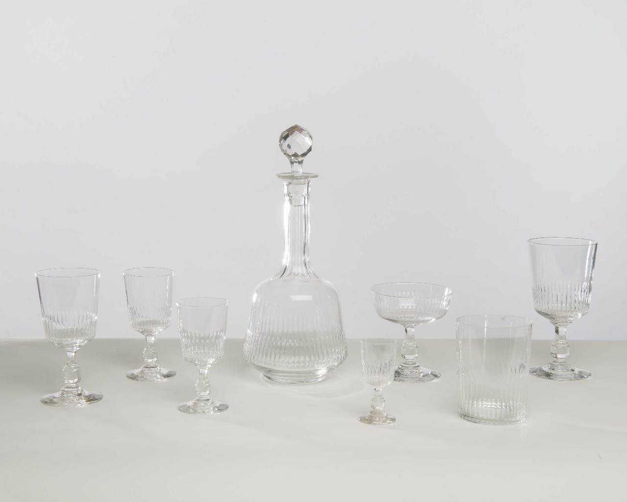Servizio di bicchieri a calice in cristallo molato, con piede circolare, stelo e coppa sfaccettata, composto da: 11 bicchieri per l'acqua, 10 bicchieri per il vino rosso, 8 bicchieri per il rosolio, 12 coppe per lo champagne, 9 bicchieri per il vino bianco, 8 bicchieri per il liquore, 10 bicchieri per lo whisky, 2 bottiglie grandi prive di tappo e 3 bottiglie leggermente più piccole col tappo.\n\n