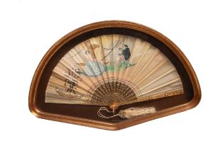 Ventaglio con stecche in bakelite incise con motivi decorativi vegetali dorati. Pavese in stoffa chiara decorata con scena di genere ambientata all'esterno, in prossimità di una fontana realizzata a ricamo con l'utilizzo di paillettes. Un ricamo dorato impreziosisce ulteriormente la decorazione. Il ventaglio è conservato in teca con cornice in legno modanato e dorato.