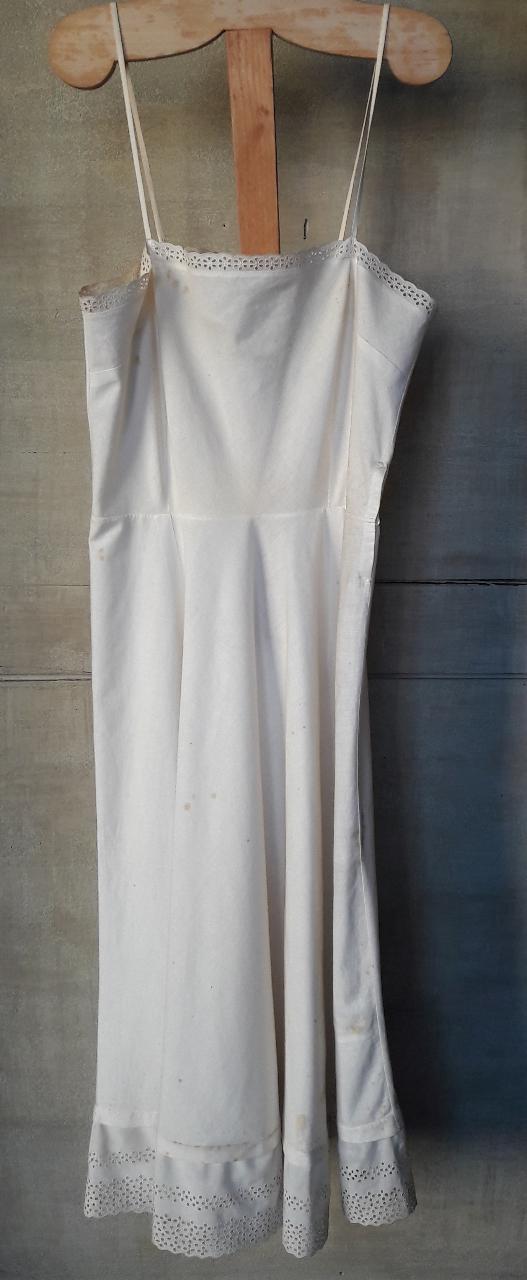 Camicia da notte femminile in cotone, senza maniche, con scollo rotondo; bordature in pizzo-merletto San Gallo. \n\n