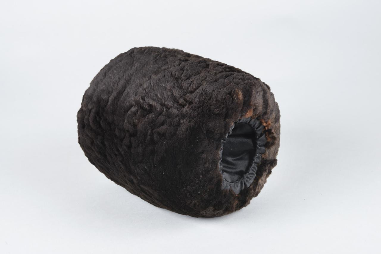 Manicotto di pelliccia, foderato di raso entro custodia originale in cartone. Etichetta Pellicceria Bernacchi di Milano.