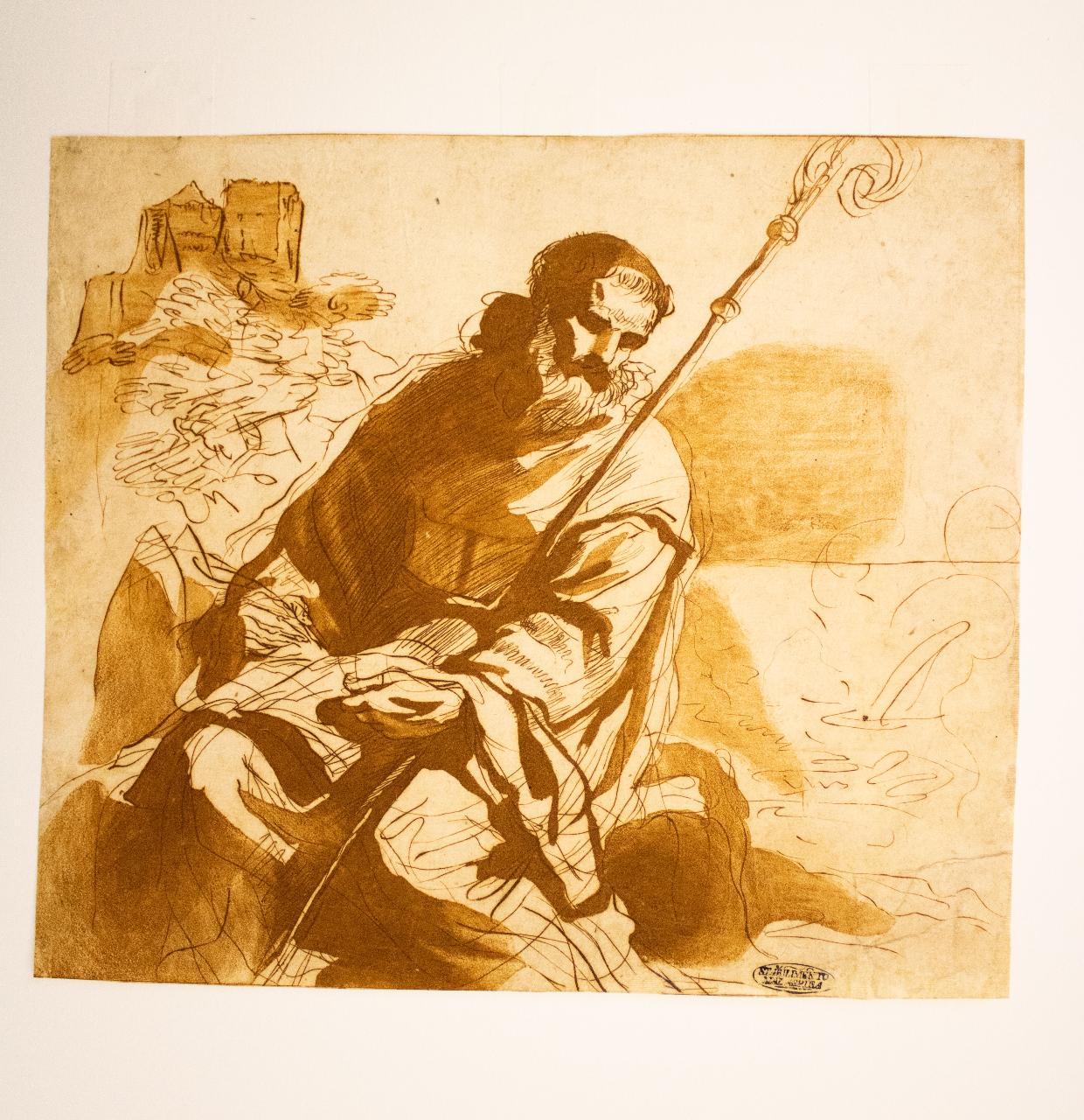 - NOTIZIE STORICO CRITICHE La figura potrebbe essere identificata come Sant'Antonio abate, difatti anche gli abati possiedono dignità episcopale, giustificando pertanto nell'opera la presenza del pastorale. \nAlle spalle del monaco, sopra un altura, sono visibili degli edifici. Questo dettaglio potrebbe far pensare a Montecassino, in questo caso il monaco potrebbe ricondurre alla "regula" di San Benedetto.\nL' opera potrebbe derivare da Giovanni Francesco Barbieri, soprannominato il Guercino.