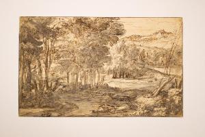 - NOTIZIE STORICO CRITICHE L'opera nel catalogo dei disegni del Soriga reca l'attribuzione a Giovanni Benedetto Castiglione detto il Grechetto (1609-1664) incisore e pittore tra i protagonisti del barocco genovese.\nDel Grechetto si ricordano diverse nature morte e scene sacre o mitologiche dove è riservata un'attenzione particolare per la vegetazione e gli animali. Le sue opere mostrano la volontà di voler ricercare innovative soluzioni spaziali e formali.\nStilisticamente l'opera si avvicina alla maniera di Gellée, Claude (1600-1682).