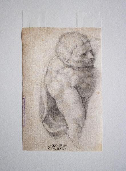 - NOTIZIE STORICO CRITICHE Il disegno pavese presenta evidenti rimandi stilistici ai disegni michelangioleschi ai quali l'artista guarda con insistenza. In particolare l'opera potrebbe riferirsi ad uno studio anatomico del Giudizio universale di Michelangelo (1475-1564) eseguito nella Cappella Sistina tra il 1536 e il 1541. \nL'opera potrebbe inoltre ispirarsi ai numerosi disegni anatomici realizzati da Michelangelo nel corso della sua carriera. Il foglio pavese era stato precedentemente attribuito ad Ambrogio Figino (1553-1608).\nDall'analisi stilistica è plausibile però che il disegno possa attribuirsi alla cerchia dell'artista o ad un allievo e non direttamente al Figino. \n