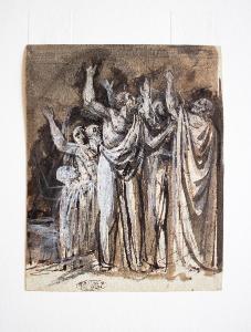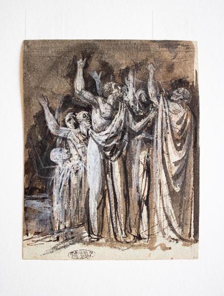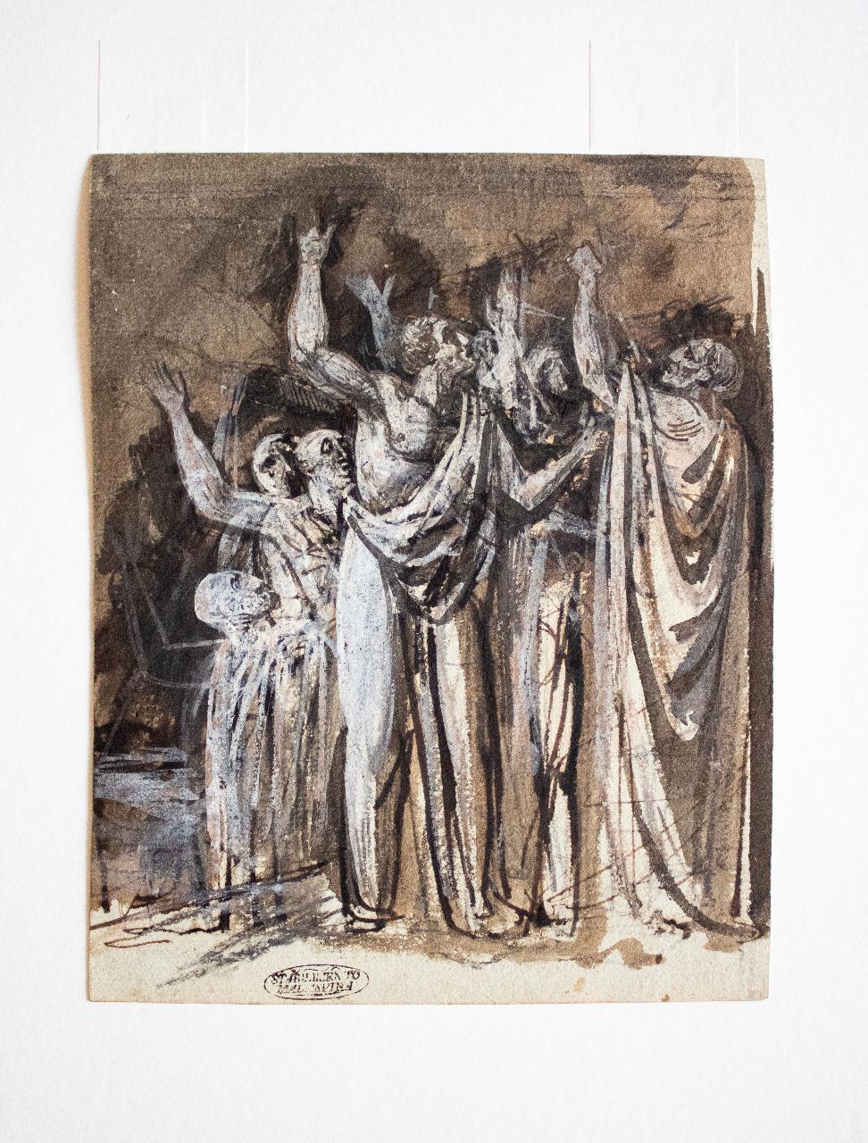 - NOTIZIE STORICO CRITICHE L' iscrizione "Camuccini" presente sul verso fa riferimento a Vincenzo Camuccini (1771-1844) pittore e restauratore esponente primario del Neoclassicismo italiano. Fu nominato da parte di papa Pio VII direttore generale della Fabbrica di San Pietro e ricevette l'incarico di sovrintendenza ai Musei Vaticani.\nIl disegno pavese potrebbe fare riferimento ai dipinti romani ispirati ai racconti di Plutarco e Tito Livio. \nIn particolare "La morte di Giulio Cesare" e "La morte di Virginia" datati al 1798.\n\n