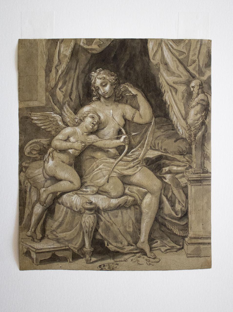 Il disegno ritrae Venere, posta su un letto seminuda, coperta soltanto sulle gambe da un panneggio. Cupido, adagiato dolcemente sul torace della dea sta per scoccare la sua freccia. La scena si svolge all'interno di una camera da letto in cui si scorge a sinistra una finestra o una nicchia e a destra una scultura a mezzo busto.