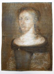 Il foglio raffigura a piena pagina il ritratto di una nobile donna in vesti regali. La donna con lo sguardo rivolto verso l'osservatore è caratterizzata da un'elegante e morbida acconciatura, qualche ciocca ricade sulle spalle lasciate scoperte dall'abito.\nSulla scollo dell'abito è applicata una piccola perla.\nSolitamente le perle erano associate soltanto a donne adulte coniugate.