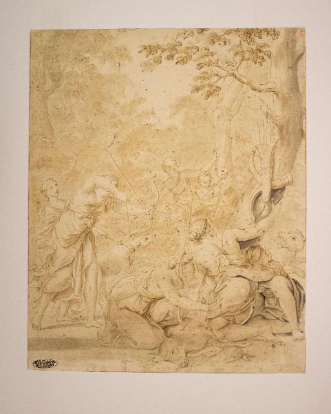 Il soggetto è quello di una scena mitologica raffigurante la dea della caccia, Diana, le ninfee e diversi animali all'interno di un bosco. \nNel disegno, alcune ninfee sono raffigurate in primo piano di spalle, nascoste dietro un alto albero. A sinistra è invece immortalato il momento in cui si sta per scoccare una freccia dall'arco.