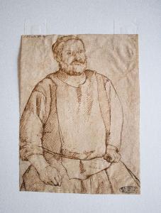 Il foglio ospita un ritratto a piena pagina raffigurante un uomo di età adulta visto di tre quarti. Il disegno è caratterizzato da linee semplici e pulite, con un lieve accenno chiaroscurale nelle vesti.\nMaggiore è l'attenzione per la realizzazione del volto che appare naturale ed equilibrato.